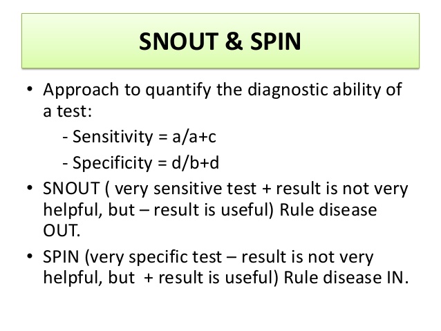 High specificity tests are very specific with what they screen for. While a highly sensitive test will say ‘We have a problem’, your highly specific test can reliably say ‘Its not the problem we are screening for’. In other words its very good at excluding.