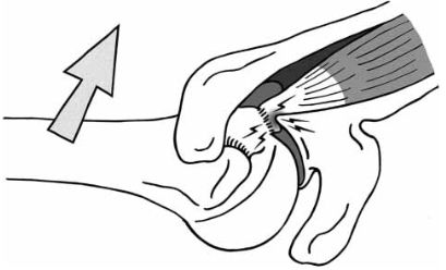 The picture below shows posterior-superior glenoid impingement in the shoulder: the rotator cuff tendon is impinged between the glenoid labrum and the greater tuberosity. Adapted from Jobe (1995).